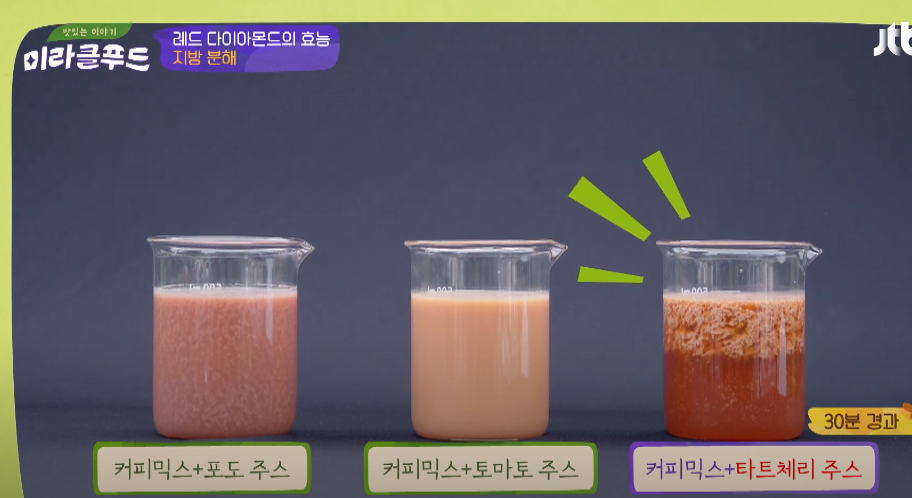 타트체리의 트랜스지방 분해 정도를 알아보기 위해 JTBC 미라클푸드에서 한 실험을 해보았는데요, (우리가 자주 즐겨 먹지만 예상외로 트랜스지방이 많이 들어있는 커피믹스로 실험을 진행하였습니다.) 커피믹스가 담겨져있는 3개의 비커에 항산화에 좋다는 포도주스, 토마토주스, 타트체리 주스를 각각 넣어보았습니다.