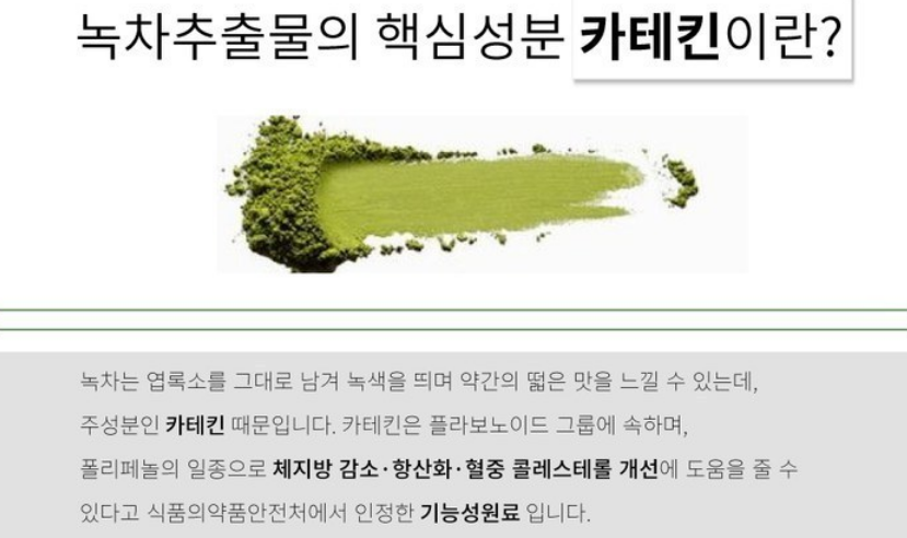 폴리페놀의 일종으로 체지방 감소에 도움을 줄 수 있다고 식약처에서 인정받은 기능성원료라 더욱더 믿고 먹을 수 있었습니다.