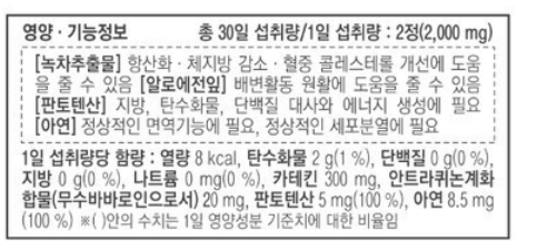 우선 알로에 전잎은 배변활동을 원활하게 하여 변비를 가지고 계신 분들이 드시면 아주 좋은 성분이고, 녹차 카테킨은 항산화 / 혈중 콜레스테롤 개선 / 체지방 감소에 도움을 주어 체중 감량에 필수적인 성분이라고 할 수 있습니다.
