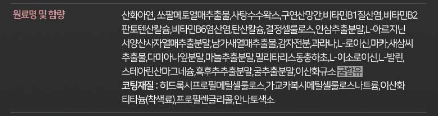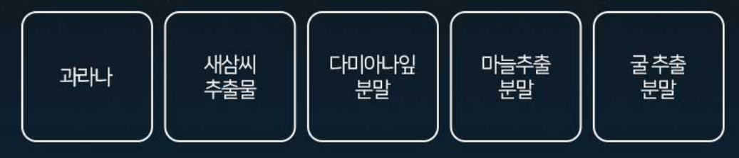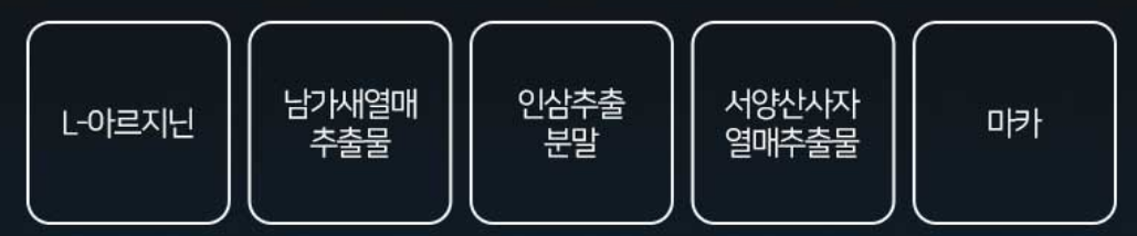 여기에 L-아르기닌, 남가새열매 추출물, 인삼추출 분말, 서양산사자 열매추출물, 과라나, 새삼씨추출물, 다미아나잎 분말, 마늘추출 분말, 마카, 굴 추출 분말 등의 부원료가 혼합되어 만들어진 제품입니다.