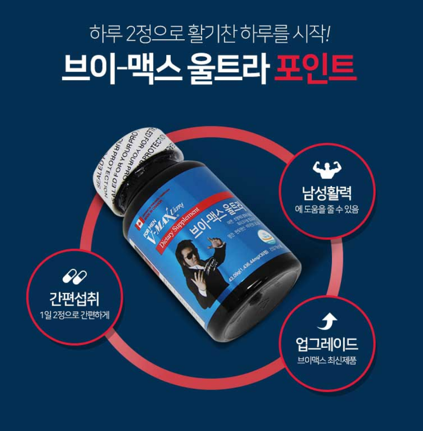 브이맥스는 남성전용 건강기능식품으로 일반적인 체내 에너지와 활력 증진에 도움을 줄 뿐만 아니라 남성분들에게 최적화된 자양강장제로 복용하시면 좋을 것 같습니다.