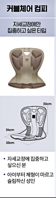 첫번째 '커블체어 컴피'는 30~70kg에 130~175cm 정도에 해당하는 비교적 마르고 슬림한 체형의 성인 혹은 덩치가 큰 아이가 사용하면 좋은 제품인데요 보다 자세교정에 집중하고자 하는 이들에게 적합한 타입의 의자입니다.