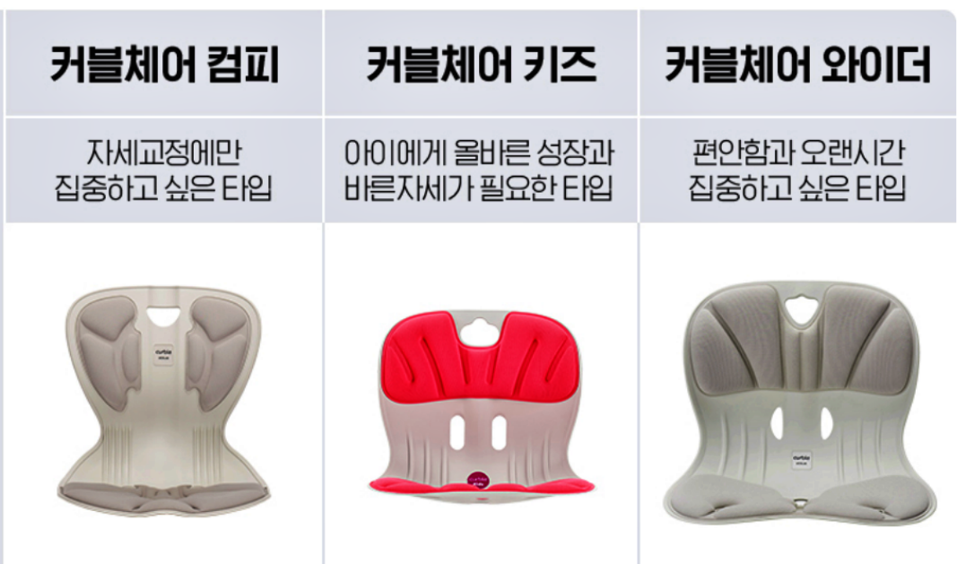 마지막 '커블체어 와이더’는 컴피의 업그레이드 버전으로 50~100kg의 체중을 가지고 있고 150~190cm정도로 키가 큰 이들 중 편안함과 자세교정에 대한 만족감을 충족시키며 강력한 지지력을 선호하는 이들에게 적합한 사이즈의 의자입니다.