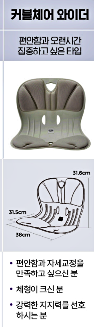 마지막 '커블체어 와이더’는 컴피의 업그레이드 버전으로 50~100kg의 체중을 가지고 있고 150~190cm정도로 키가 큰 이들 중 편안함과 자세교정에 대한 만족감을 충족시키며 강력한 지지력을 선호하는 이들에게 적합한 사이즈의 의자입니다.