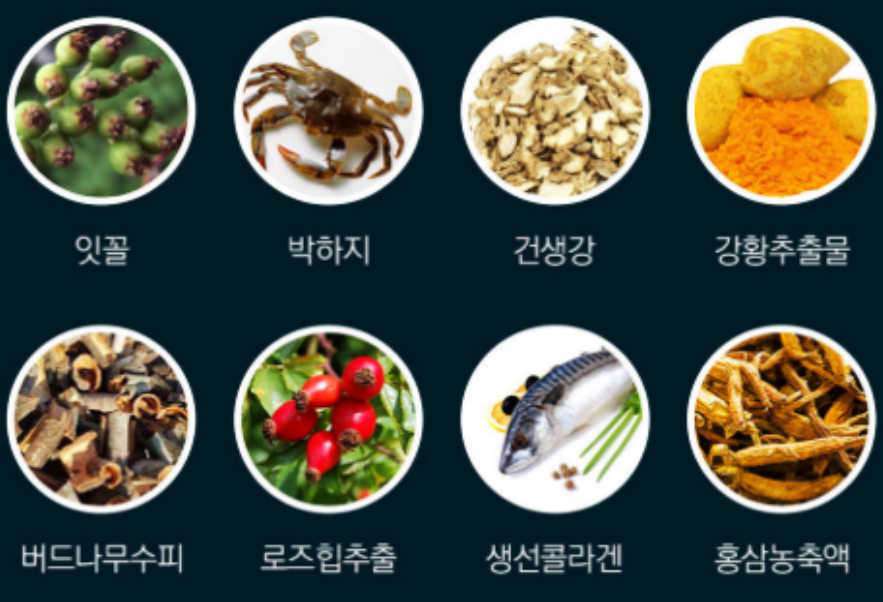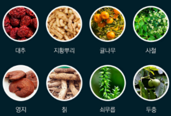 대추 / 지황뿌리 / 귤나무 / 사철 / 영지 / 칡 / 쇠무릅 / 두충 / 침당귀 / 황귀 / 천궁 / 가시오가피 / 녹용 / 모과열매 / 오미자 / 복분자 / 잇꼴 / 박하지 / 건생강 / 강황추출물 / 버드나무수피 / 로즈힙추출물 / 생선콜라겐 / 홍삼농축액 / 보스웰리아추출물 / 겨우살이 / 감초뿌리
