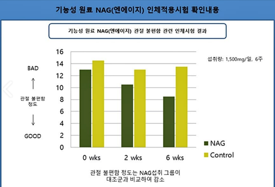 이 NAG라는 성분은 'N-아세틸글루코사민'의 약자로 관절 및 연골 건강에 도움을 주는 성분으로 유명합니다.