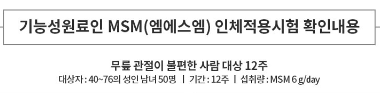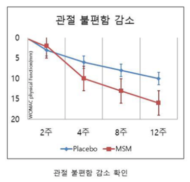 하루에 MSM을 6g/day씩 섭취하게 한 결과 대부분의 실험자에게서 '관절 불편함 감소' 및 '관절 통증 감소' 등의 결과가 나타났습니다.