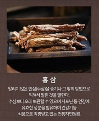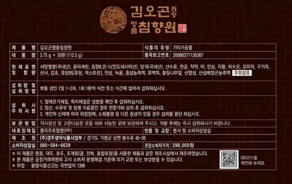 김오곤 침향원의 성분은 주원료인 침향(沈香)과 공진단에서의 식품원료로 사용할 수 있는 다양한 부원료가 함유되어 있습니다.