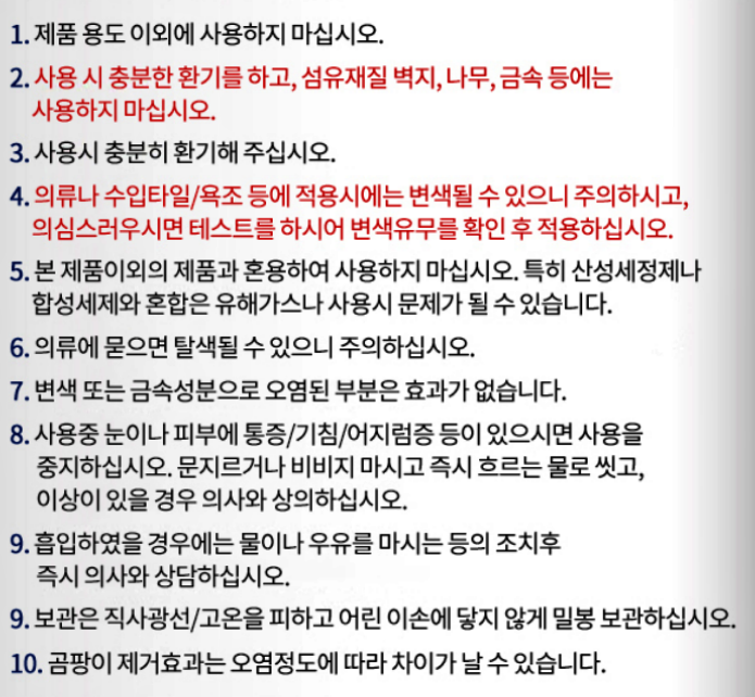 * 의류나 수입 타일 , 욕조 등에 사용할 때 가끔 변색 위험이 있으니 사용 전 테스트를 하시어 변색유무를 확인한 후에 사용하시는 것이 안전합니다 :)