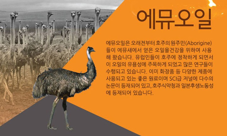 이 에뮤오일이 관절 건강에 도움을 줄 수 있다는 사실이 밝혀지면서 에뮤오일을 사용한 '에뮤크림'이 한 때 정말 핫했었는데요, 이 에뮤오일 성분은 현재 다양한 화장품의 재료로 사용되고 있는 귀한 원료이고, SCI급 저널 다수의 논문에 등재, 호주 식약청과 일본후생노동성 등에 등재되어 있다고 합니다.