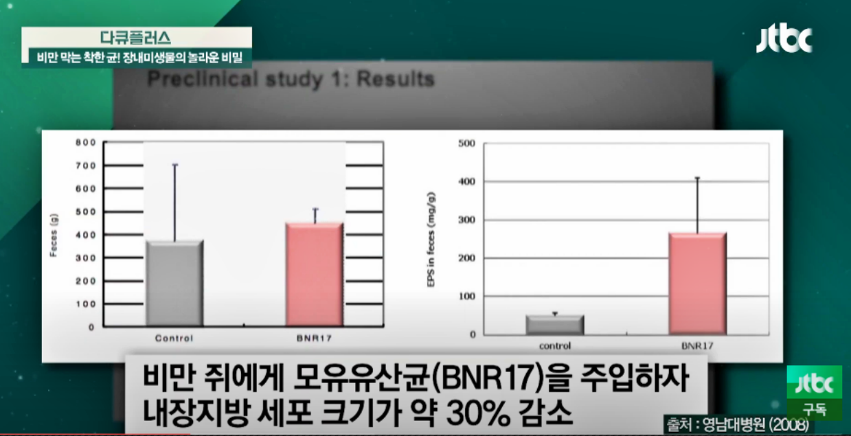 한 실험에 의하면 비만 쥐에게 모유 유산균 BNR17을 주입하자 내장지방 세포의 크기가 약 30% 감소하였고, 대변 속 탄수화물 배출량은 5배나 증가하였습니다.