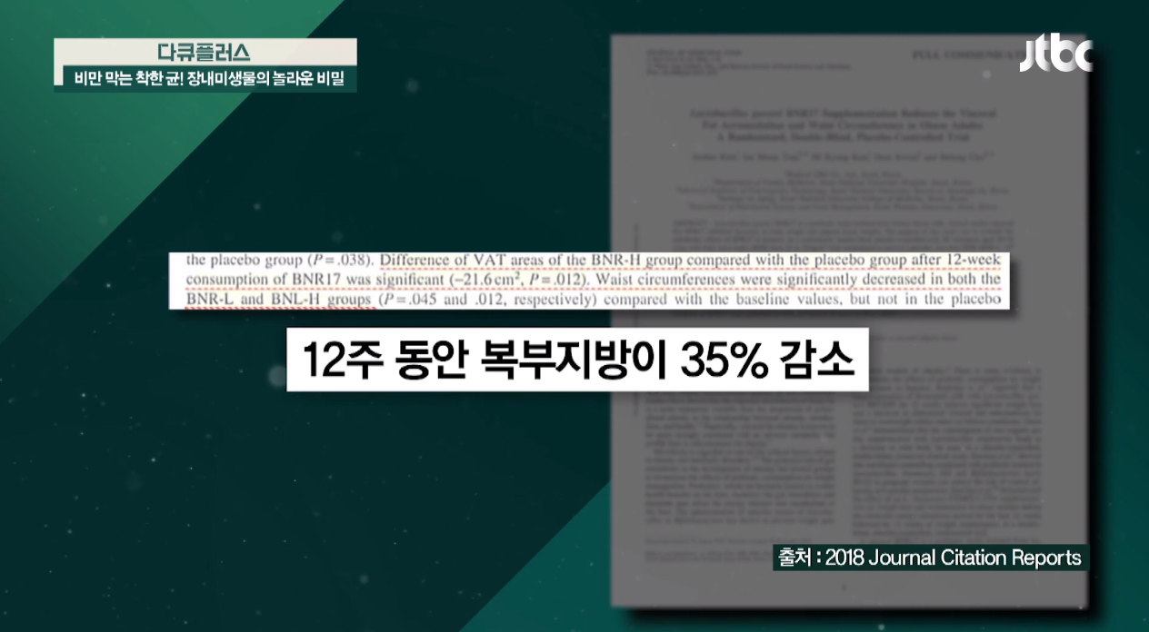 또한 과체중자들을 대상으로 12주 동안 BNR17 유산균을 섭취하게 하였는데, 과정을 지켜 본 결과 복부지방이 35% 감소, 허리둘레는 평균 5cm 가량 줄어들은 사례가 있었습니다.