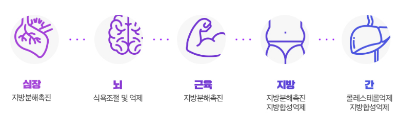 지방 분해를 촉진하고, 지방 합성을 억제하는 것 뿐만 아니라, 식욕을 억제하는 데에도 효과적이어서 다이어트 할 때 섭취하면 보다 슬기로운(?) 다이어트를 할 수 있을 것 같습니다.