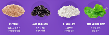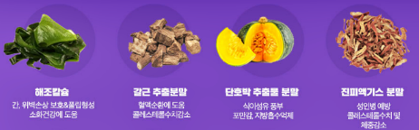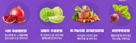 해조칼슘 / 갈근 추출분말 / 단호박 추출물 분말 / 진피엑기스 분말 / 석류 추출물 분말 / 양배추 추출분말 / 유기농15종 과채혼합분말 / 비트루트분말 / 차전자피 / 푸룬 농축 분말 / L-카르티닌 / 병풀 추출물 분말