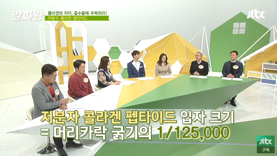 얼마 전까지만 하더라도 우리가 보통 먹는 콜라겐을 떠올리면 돼지껍데기 등과 같은 육류콜라겐을 떠올렸는데 육류콜라겐 같은 경우에 분자량이 커서 체내 흡수율이 매우 떨어졌습니다.