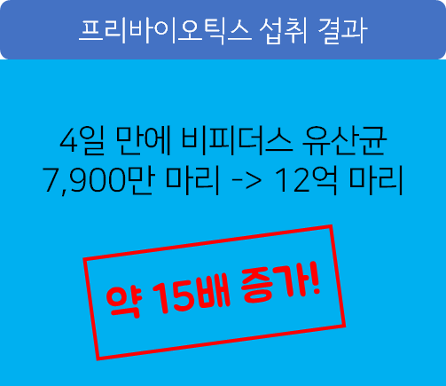 실제 성인들을 대상으로 진행된 한 연구에서 프리바이오틱스를 섭취하게 한 결과 4일 만에 비피더스 유산균 7,900만 마리가 12억 마리로 증가해 약 15배나 증가해다는 연구 결과가 있었습니다.