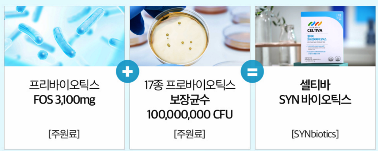 '신프리바이오틱스'는 프로바이오틱스와 + 프리바이오틱스가 합쳐진 멀티 유산균인데요, 셀티바 제품의 경우 유산균의 먹이인 프리바이오틱스와 17종 유산균을 동시에 섭취할 수 있어 기능적인 측면에서 매우 좋았습니다.