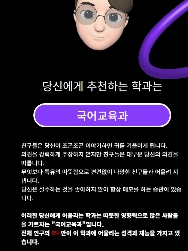 근데 테스트 결과는 어느 정도 맞는 것 같긴 해요! 다만 어울리는 학과가 이해안갈 뿐!!