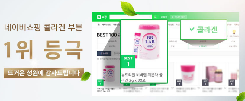 콜라겐 제품을 알아보니까 주변에서 비비랩 콜라겐을 많이 추천해 주셨는데요, 2초에 1포씩 판매되기도 하고, 2019년 1월 4일 기준 네이버쇼핑 콜라겐 부분에서 1위에 등극 할 정도로 인기있는 제품이더라구요!