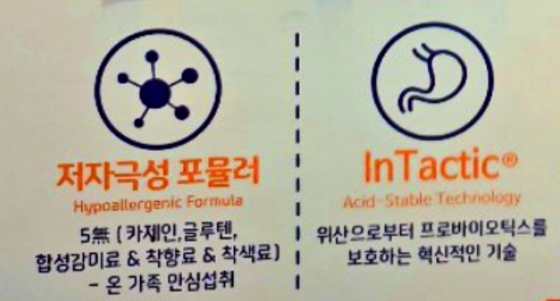 앞에서 잠깐 말씀드렸다시피 프로바이오틱스는 최대한 많은 양이 장까지 도달하는게 중요하다고 말씀드렸는데 이 제품은 '인택틱 기술'을 사용하여 위산으로부터 프로바이오틱스를 보호해 보다 많은 수의 보장균수를 보장한다고 합니다.
