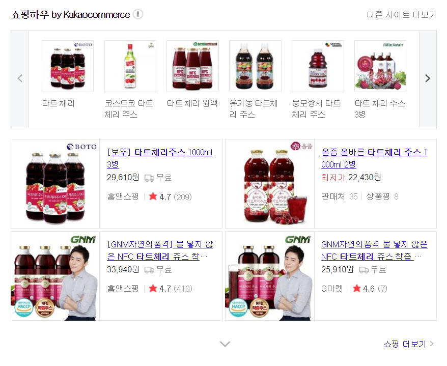 네이버에서 '타트체리 주스'라는 키워드로 검색을 해보니 9월 11일 기준 20,957건의 상품이 올라와 있었고, 다음(카카오 쇼핑) 기준으로는 18,954건의 상품이 올라와 있었습니다.