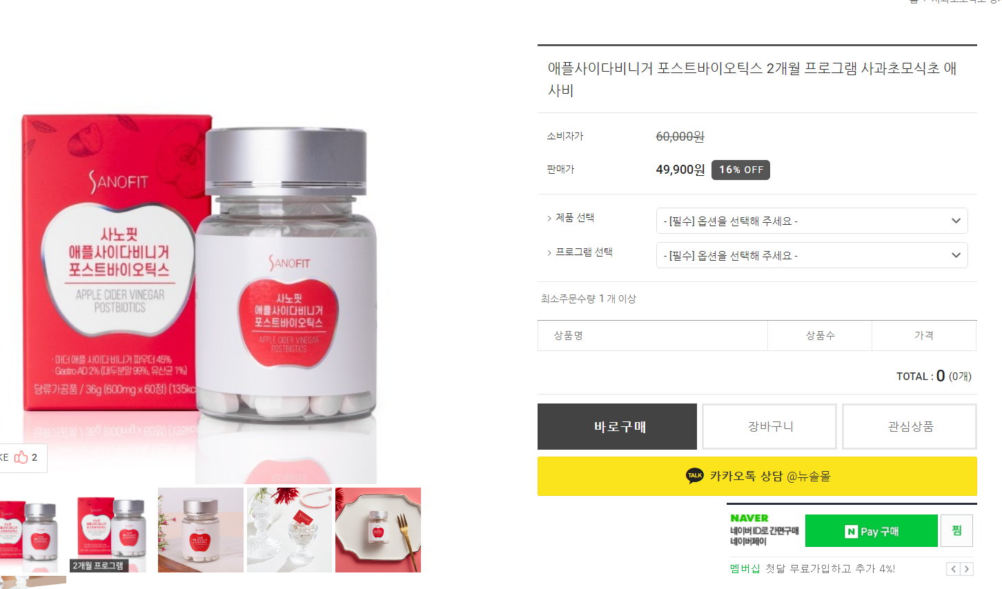 바로 사노핏에서 나온 애플 사이다 비니거(사과 초모식초) 포스트바이오틱스인데요, 가격은 현재 2개월분 할인가로 60,000 → 49,900원에 구매가 가능합니다.