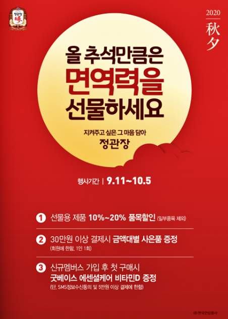 현재 정관장에서는 한가위를 맞아 9월 11일 ~ 10월 5일까지 프로모션 이벤트를 진행하고 있다고 해요!