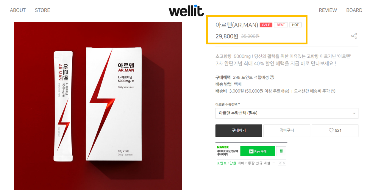 웰릿 아르맨은 주원료인 아르기닌이 1포에 5,000mg나 함유되어 있는 제품인데 이는 국내 최대 함량을 자랑한다고 합니다.