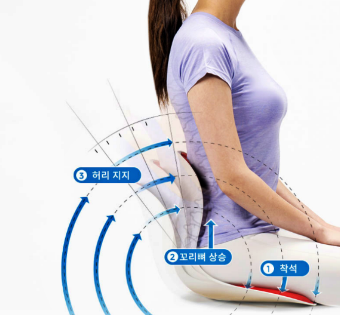 우리가 의자에 앉게되면 지렛대 원리에 의해 허리 뒤 쪽에 힘이 가해지면서 자연스럽게 꼬리뼈가 상승하고 동시에 허리가 쫙-펴지게 끔 도와준다고 해요.