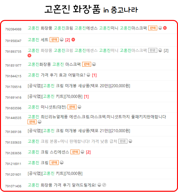중고나라 혹은 당근마켓에 들어가서 검색란에 '고혼진'을 치시면 고혼진 화장품의 가격을 간접적으로나마 확인하실 수 있습니다.