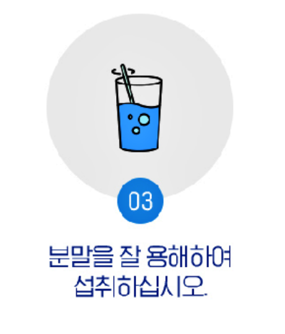 주의 할 점은 60도 이상의 뜨거운 물에 드시게 되면 단백질 변성 등 영양소가 파괴될 수도 있으니 가급적 30~40도 정도되는 미온수에 드시는 것이 좋습니다.