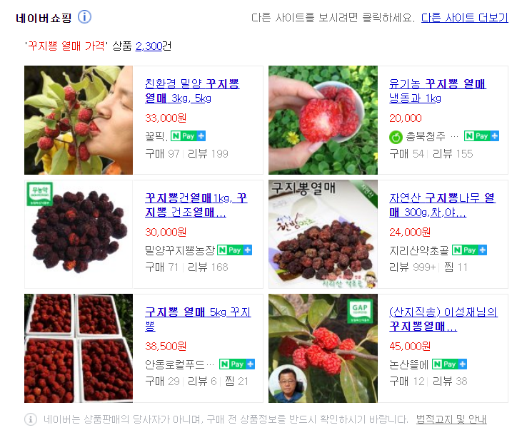 꾸지뽕 열매 가격은 인터넷 포털 사이트를 통해 쉽게 아실 수 있는데요, 제가 알아 본 결과 유통업체마다 가격의 차이는 있으나 꾸지뽕 열매 5KG 기준으로 약 35,000 ~ 55,000원 정도에 판매되고 있습니다.