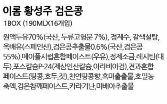이 두유는 100% 국산 검은콩을 사용하였는데, 우리 땅에서 자란 콩으로 만들어 맛이 더욱 풍부하고, 건강에 도움을 주는 국산 검은콩과 비타민B1, B2, 무기질 및 아미노산 등의 영양이 풍부하다고 알려진 흑미, 세사민, 세사몰린, 세사미놀 등의 성분이 함유되어 있는 검은 참깨를 넣어 맛과 영양 두 마리 토끼를 모두 잡은 두유라고 할 수 있습니다.