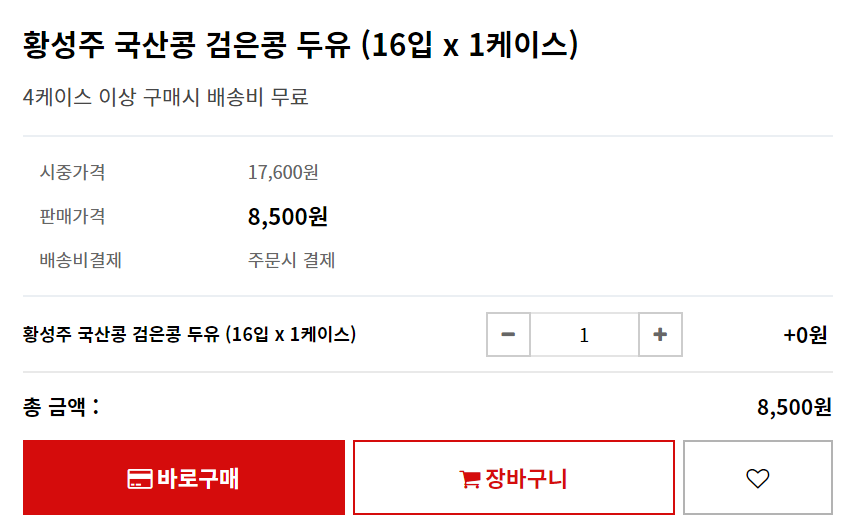 황성주 검은콩 두유는 이롬 웰빙몰에서 구매가 가능한데요, 16입 1BOX의 가격이 8,500원에 올라와 있습니다.