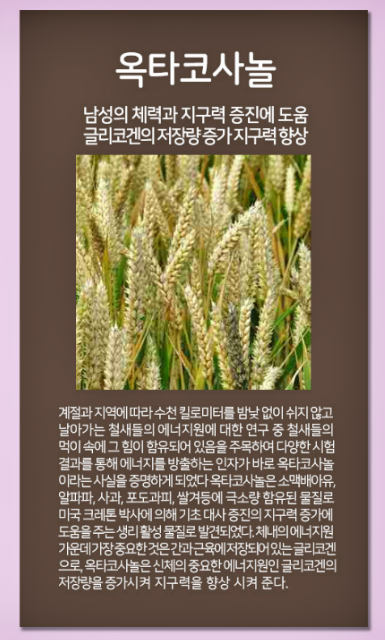 옥타코사놀은 소맥배아유, 알파파, 사과, 포도과피, 쌀겨 등에 소량 함유된 물질로 미국 크레톤 박사에 의해 기초 대사 증진의 지구력 증가에 도움을 주는 생리활성 물질로 발견되었습니다.