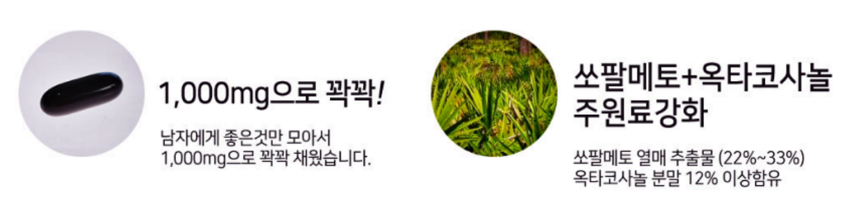 쏘팔메토 열매 추출물(22~33%)에 옥타코사놀 분말 12% 이상이 함유되어 있어 전립선 때문에 불편함을 호소하고 계신 중년 남성들에게 적합한 건강기능식품입니다.