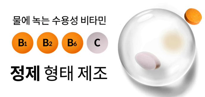 비타민은 정제 타입과 캡슐 타입 두 가지 형태로 이루어져 있는데 물에 녹는 수용성 비타민 B1, B2, B6, C가 정제 형태로, 지방에 녹는 지용성 비타민 A, D, E 가 캡슐 형태로 만들어 졌습니다.