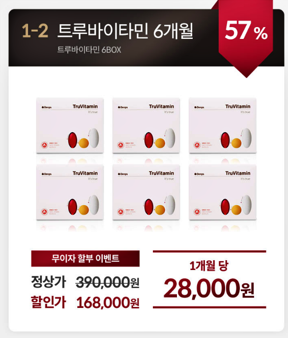 트루바이타민은 덴프스몰 공식 판매처에서 구매할 수 있는데요, 가격은 2주분 : 22,000원 / 3개월분 : 99,000원 / 6개월분 168,000원 / 12개월분 : 316,000원에 판매되고 있습니다.