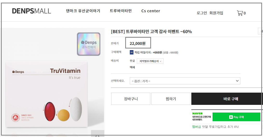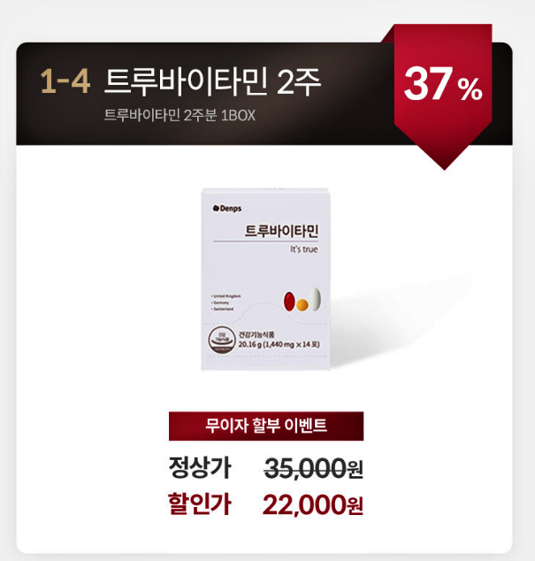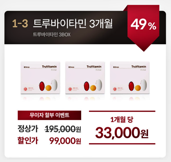 트루바이타민은 덴프스몰 공식 판매처에서 구매할 수 있는데요, 가격은 2주분 : 22,000원 / 3개월분 : 99,000원 / 6개월분 168,000원 / 12개월분 : 316,000원에 판매되고 있습니다.