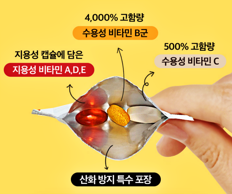 비타민은 정제 타입과 캡슐 타입 두 가지 형태로 이루어져 있는데 물에 녹는 수용성 비타민 B1, B2, B6, C가 정제 형태로, 지방에 녹는 지용성 비타민 A, D, E 가 캡슐 형태로 만들어 졌습니다.