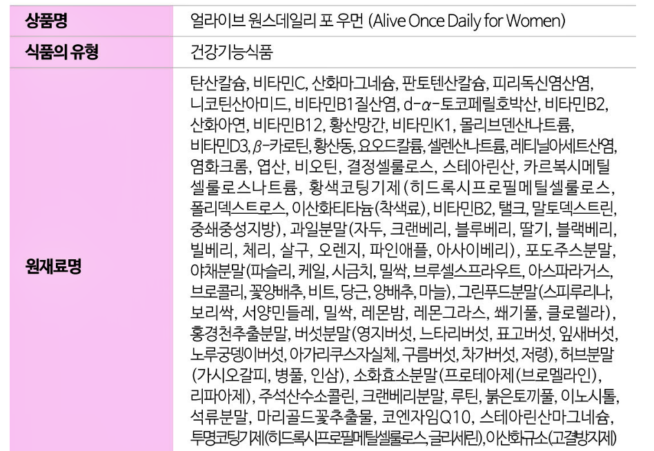 : 얼라이브 포 우먼은 22가지 비타민, 무기질과 55가지 보조성분이 함유된 비타민으로 여성에게 꼭 필요한 영양소 만을 함유해 만들어진 제품입니다.