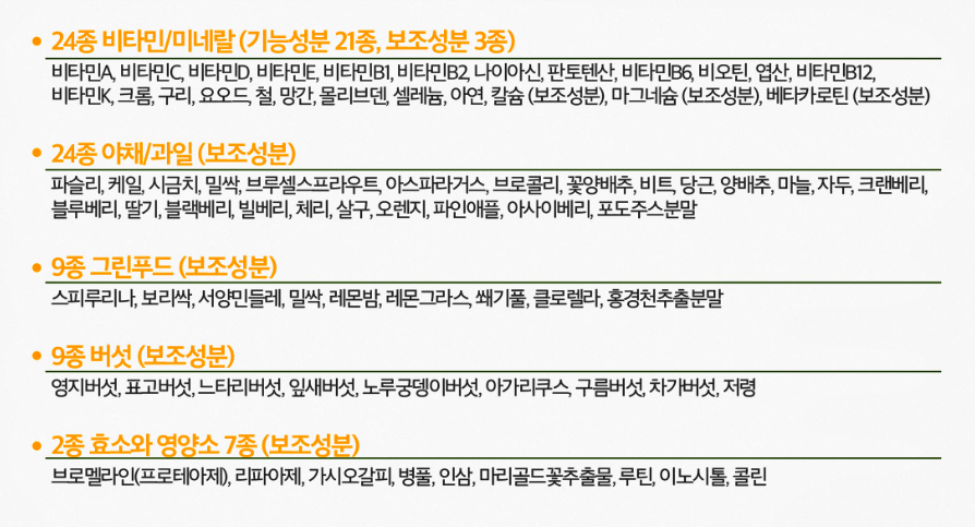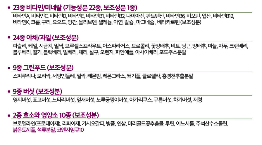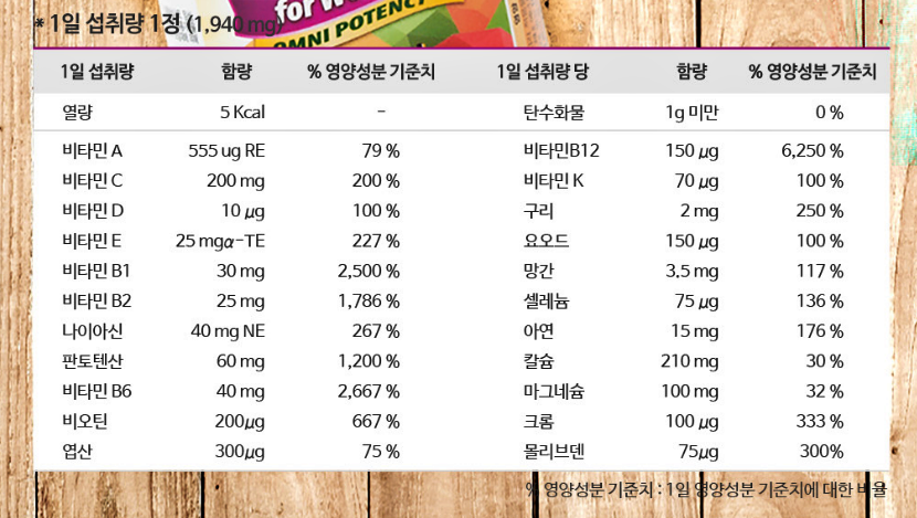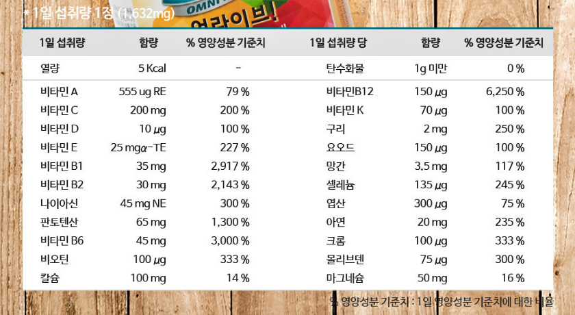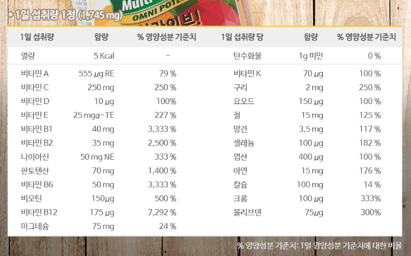 함유되어 있는 대부분의 영양소가 일일 권장량을 충족해 하루 1알로 관리가 가능한 올인원 멀티 비타민이라고 할 수 있겠네요.