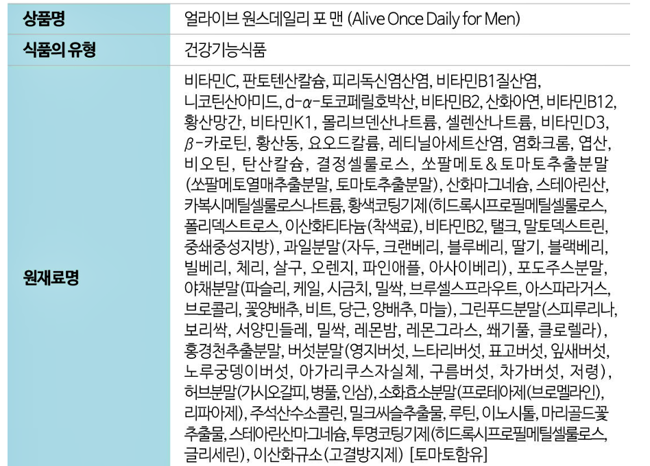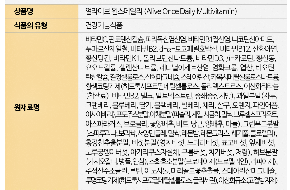 얼라이브 멀티비타민 성분 정보