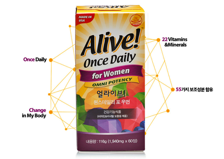 : 얼라이브 포 우먼은 22가지 비타민, 무기질과 55가지 보조성분이 함유된 비타민으로 여성에게 꼭 필요한 영양소 만을 함유해 만들어진 제품입니다.