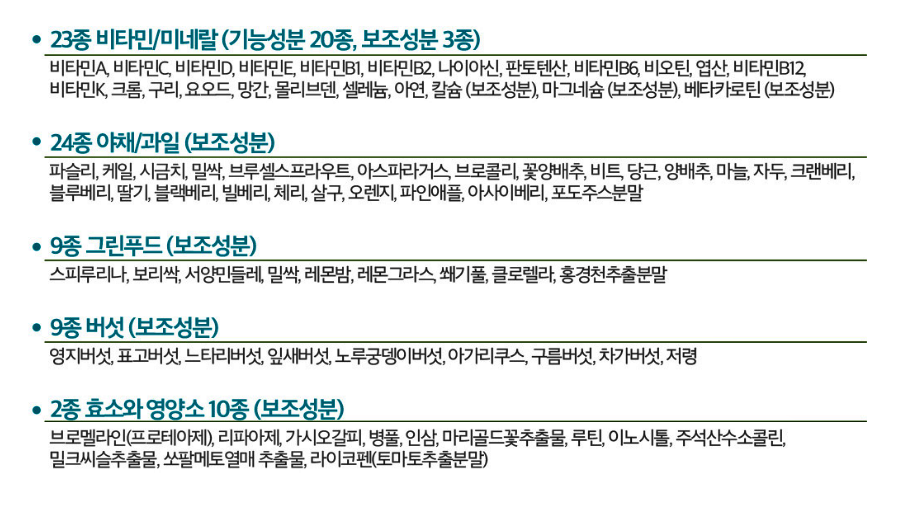 : 원스데일리 비타민은 21가지 기능성 비타민, 무기질과 54가지 부원료가 배합되어 만들어졌습니다.