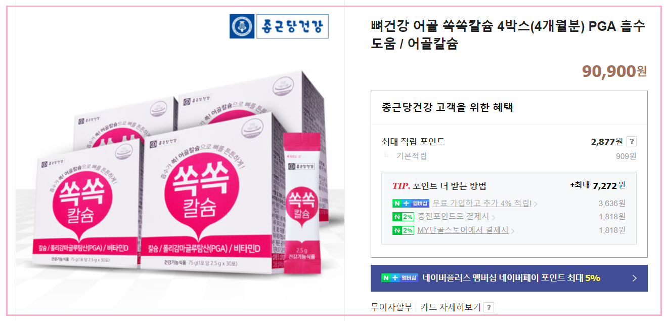 종근당 어골칼슘은 종근당 건강 공식 온라인 스토어에서 4개월분 90,900원이라는 할인된 가격에 판매하고 있습니다.
