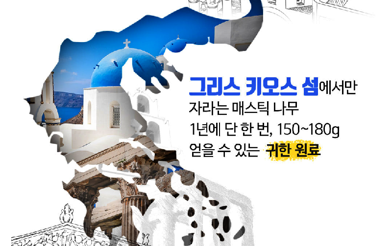 매스틱은 그리스 키오스 섬에서만 자라는 나무로 1년에 단 한 번만, 150~180g 정도밖에 되지 않는 소량만 얻을 수 있는 귀한 원료라고 해요. 따라서 매스틱 검을 원료로한 제품들은 가격대가 꽤 높게 형성되어있는 편이죠.