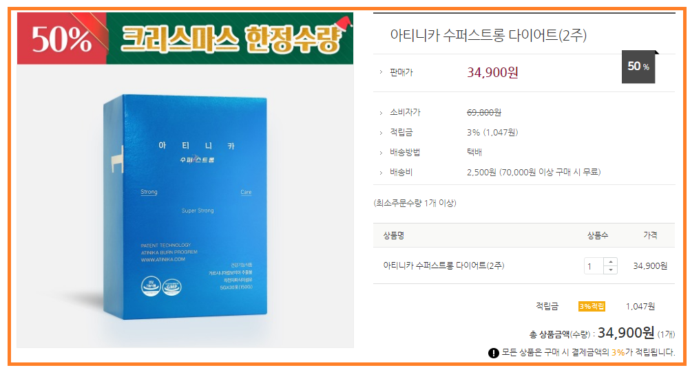 아티니카 수퍼스트롱은 현재 아티니카 공식 온라인몰에서 34,900원 50%할인 된 가격으로 판매되고 있습니다.
