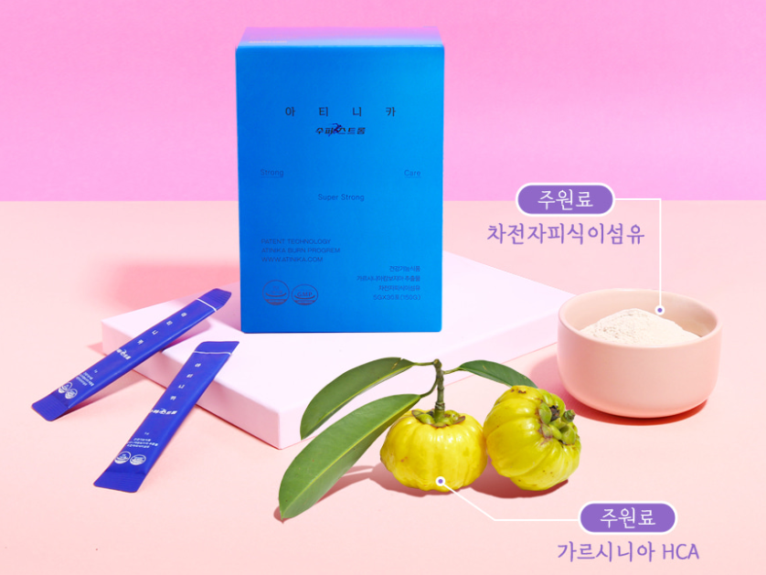 아티니카 수퍼스트롱의 주원료는 '가르시니아'와 '차전자피 식이섬유'입니다.