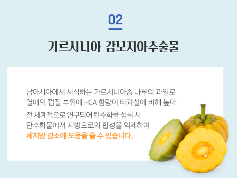 : 가르시니아는 남아시아에서 서식하는 열대식물인 가르시니아종 나무의 과일로, 열매껍질 부위에 HCA(Hydroxycitric acid)함량이 타 과실에 비해 매우 높아, 탄수화물 섭취 시 지방으로 전환되는 과정에서 지방 합성을 억제하는 역할을 합니다.